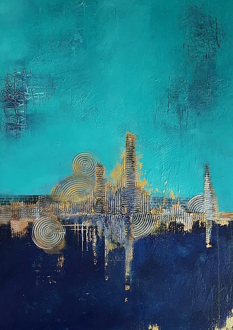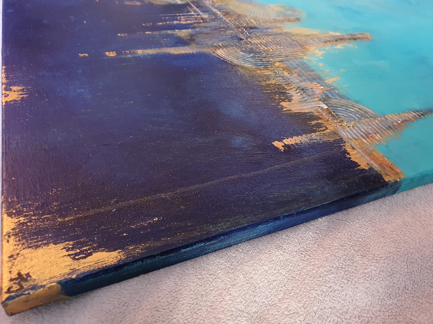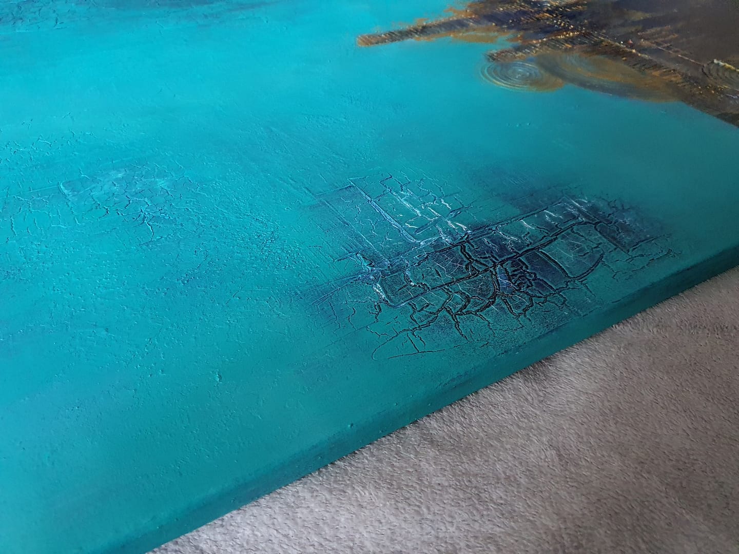 - Materialien: Acrylfarben Türkis, Blau, Silbe, Gold, Strukturpaste
