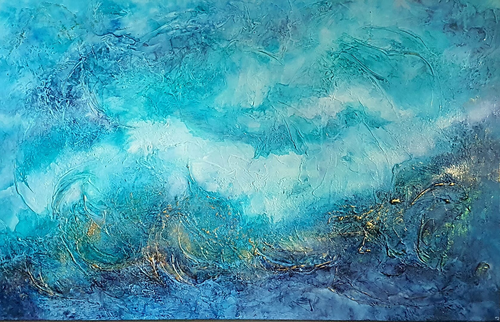 Für dieses Kunstwerk setzte ich Strukturpasten auf Acrylbasis sowie hochpigmentierte Spezialfarben auf Alkoholbasis ein (Alcohol inks)