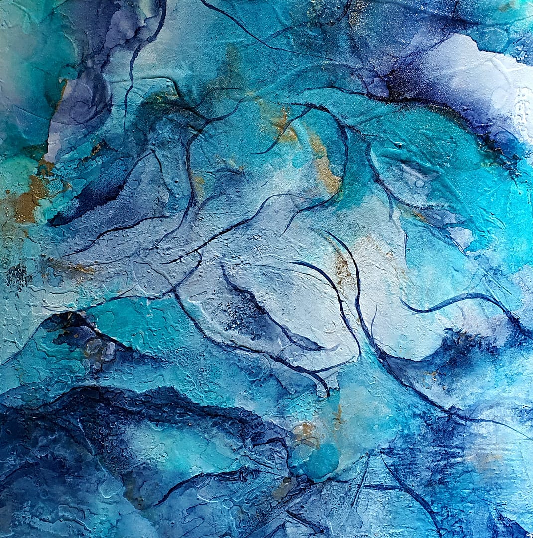 Für dieses Kunstwerk setzte ich Strukturpasten auf Acrylbasis sowie hochpigmentierte Spezialfarben auf Alkoholbasis ein.