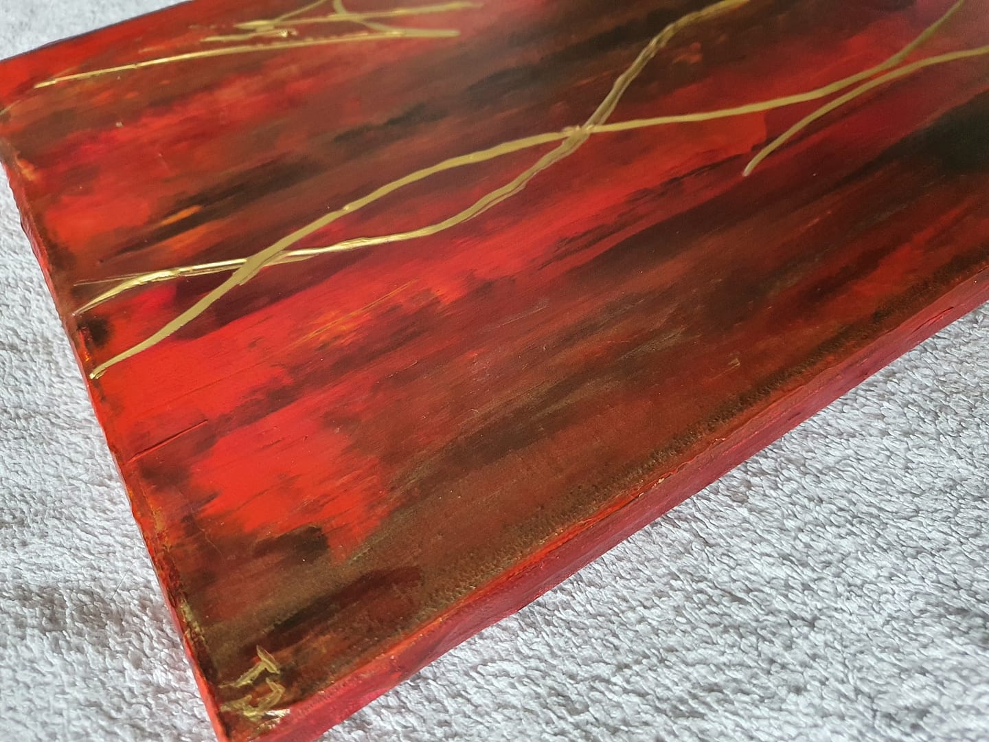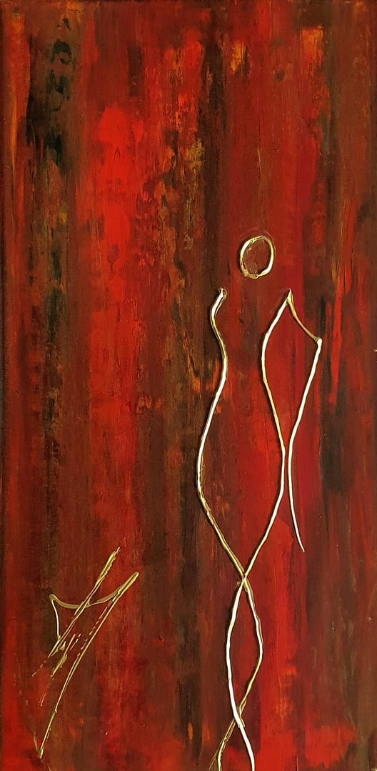 - Die Figur ist erhaben mit pastöser Acrylfarbe auf den rot strukturierten Hintergrund gemalt