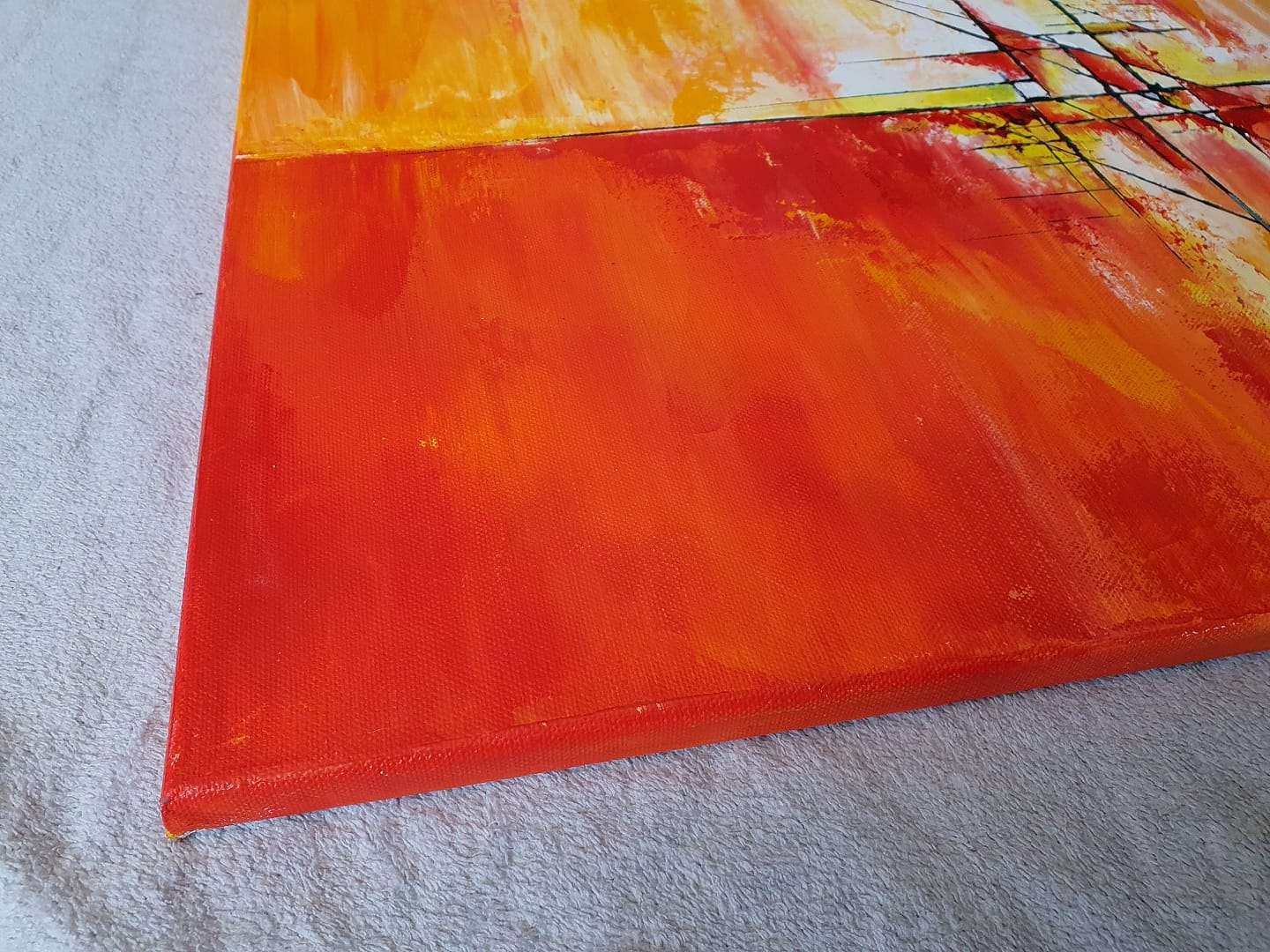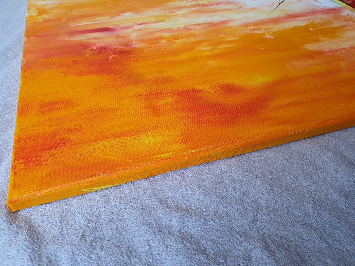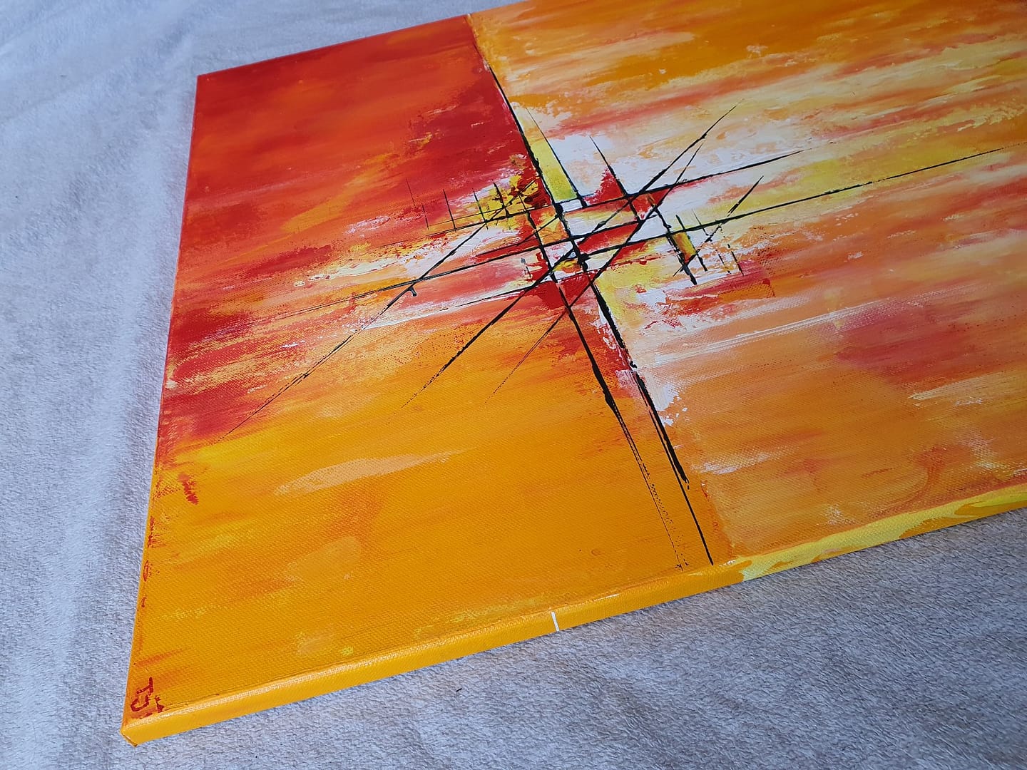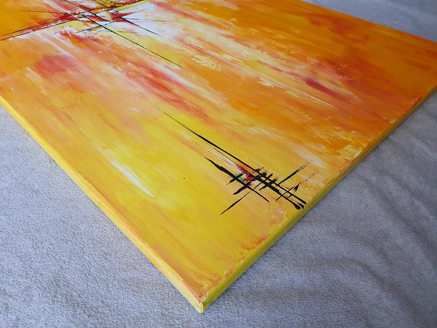 Das vierte Gemälde aus der Serie LichTräume. Helle, leuchtende Gelb- und Orangetöne dominieren und bringen Licht, Wärme und Farbenfreude in jeden Raum.