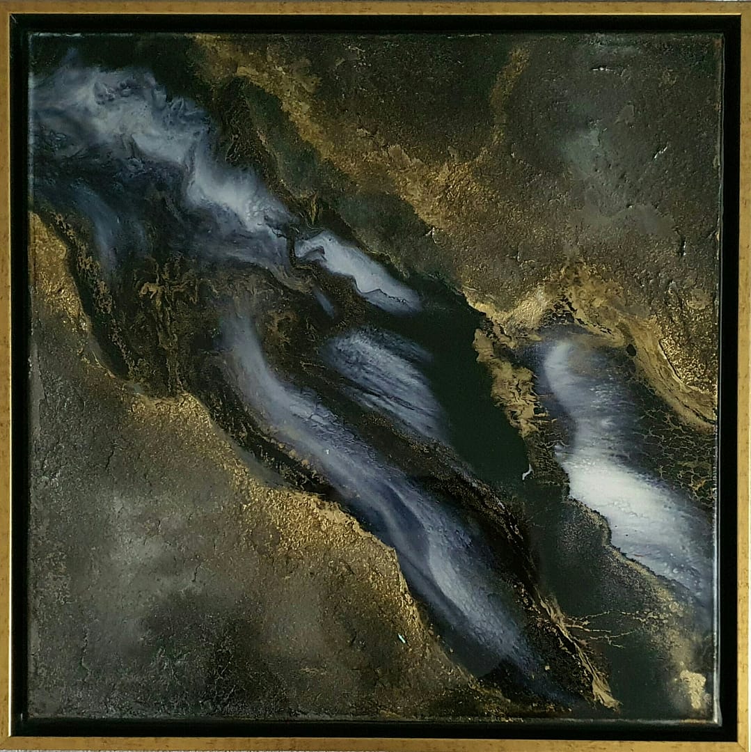 Materialien: Strukturpaste, Resin, Acrylfarben und -tinten in Schwarz, Weiß, Grau und Gold