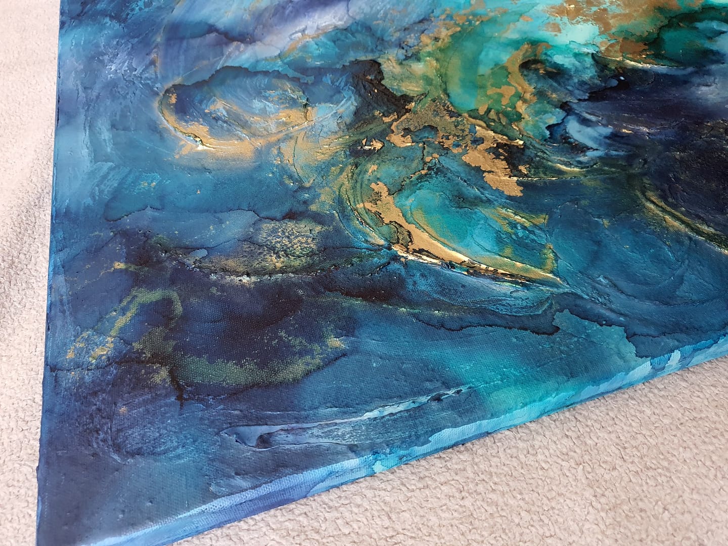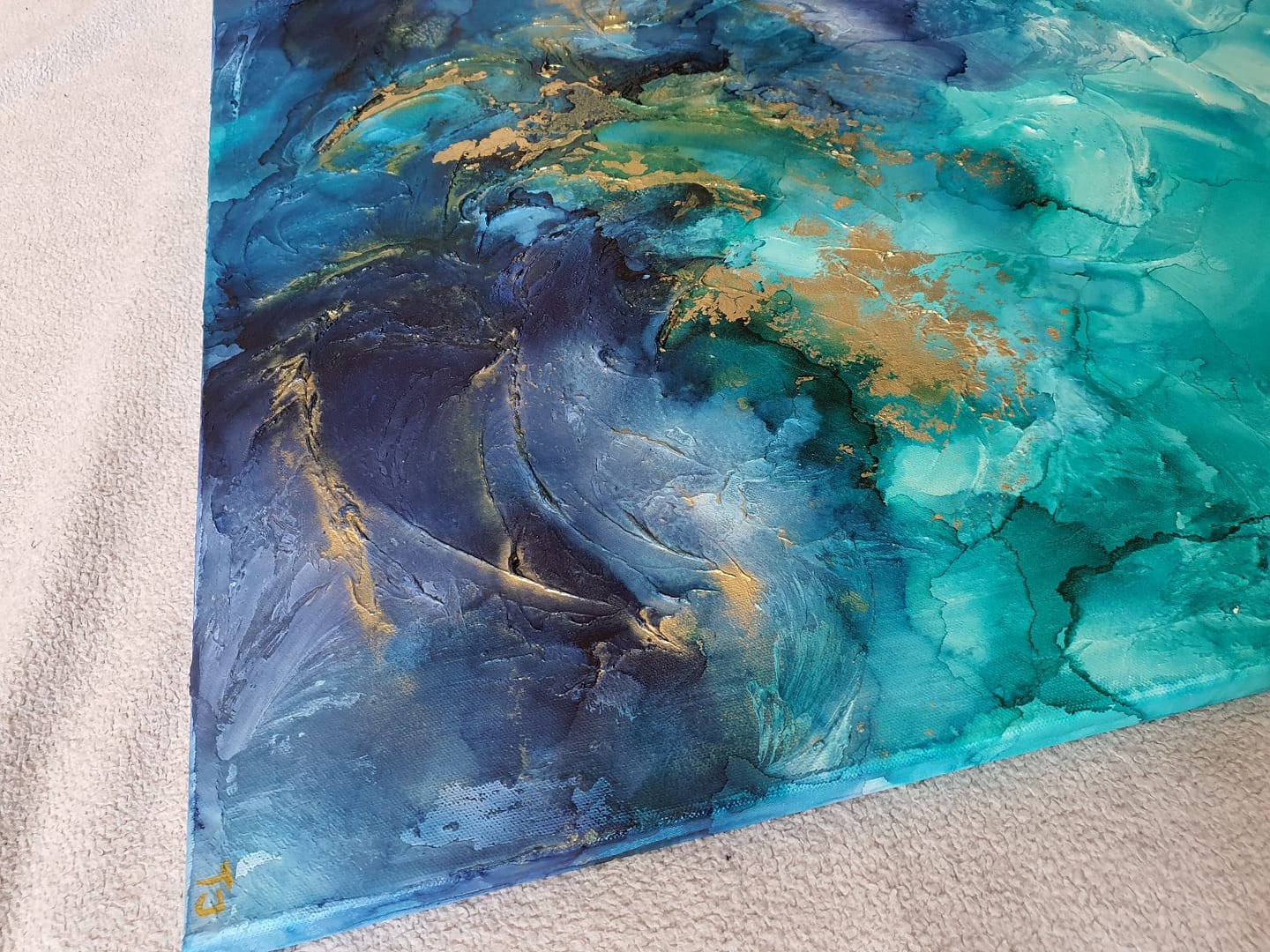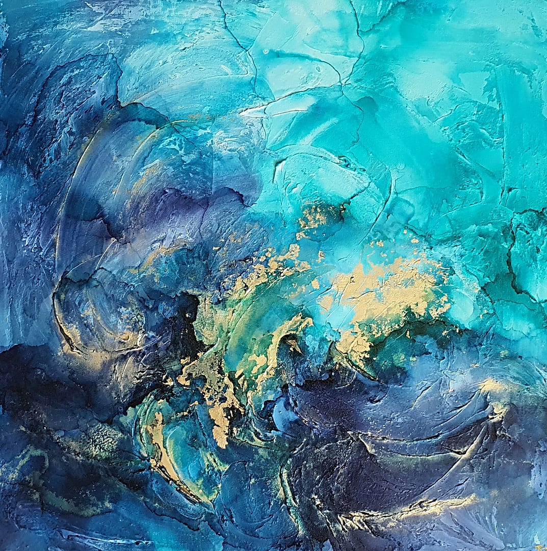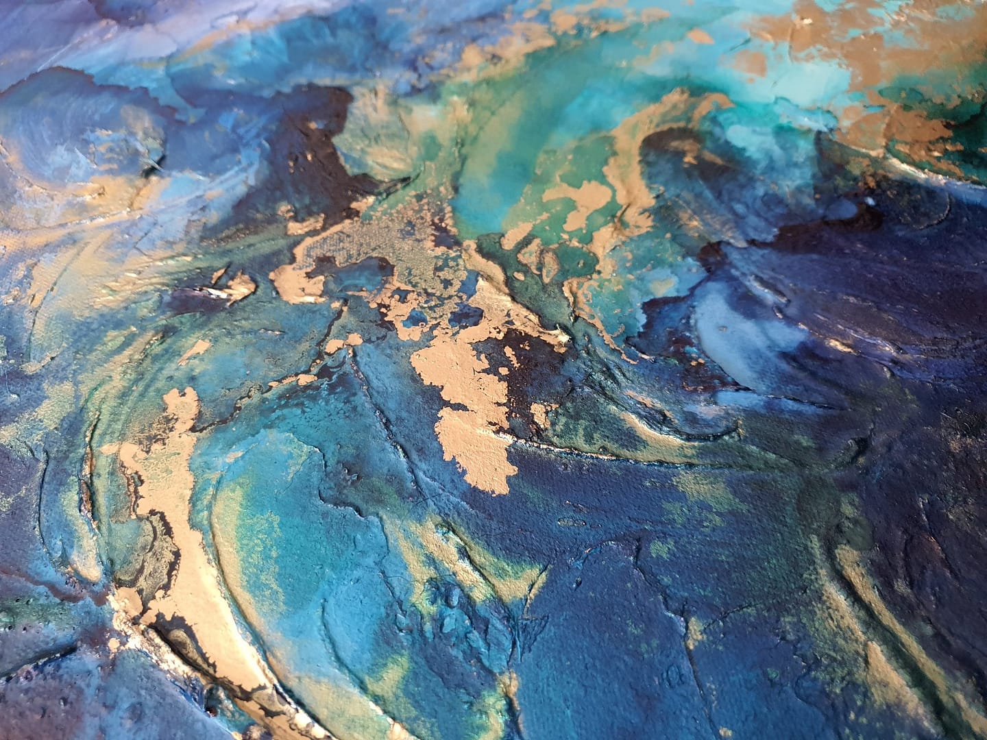 Für dieses Kunstwerk setzte ich Strukturpasten auf Acrylbasis sowie hochpigmentierte Spezialfarben auf Alkoholbasis ein. Alle verwendeten Produkte sind von höchster Qualität und zeichnen sich durch eine exzellente Farbbrillanz und Lichtechtheit aus