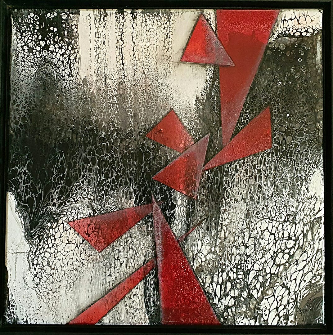 - Die Dreiecke sind mit metallic-roter Acrylfarbe und Pastellkreiden auf das getrocknete Pouring-Bild aufgemalt